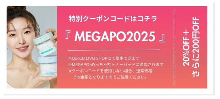 『MEGAPO×めっちゃ割』特別価格にてトナーパッドを購入するにはQoo10 LIVO SHOPにて下記の秘密クーポンコードを入れるだけ!