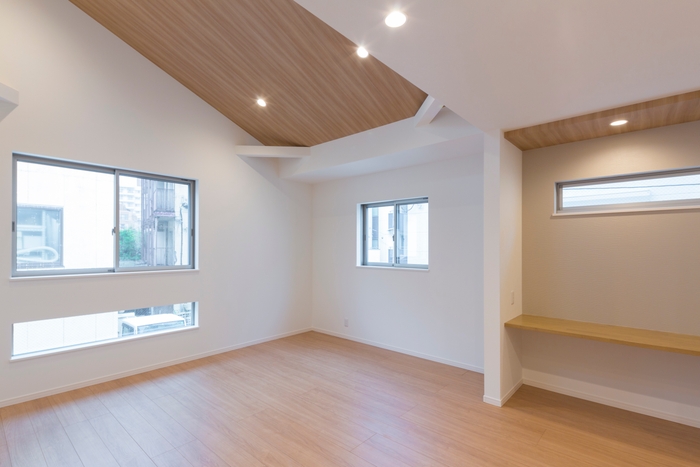 勾配天井を配したリビング空間には上部からも陽の光が差し込み、室内が広く明るい雰囲気に包まれます。