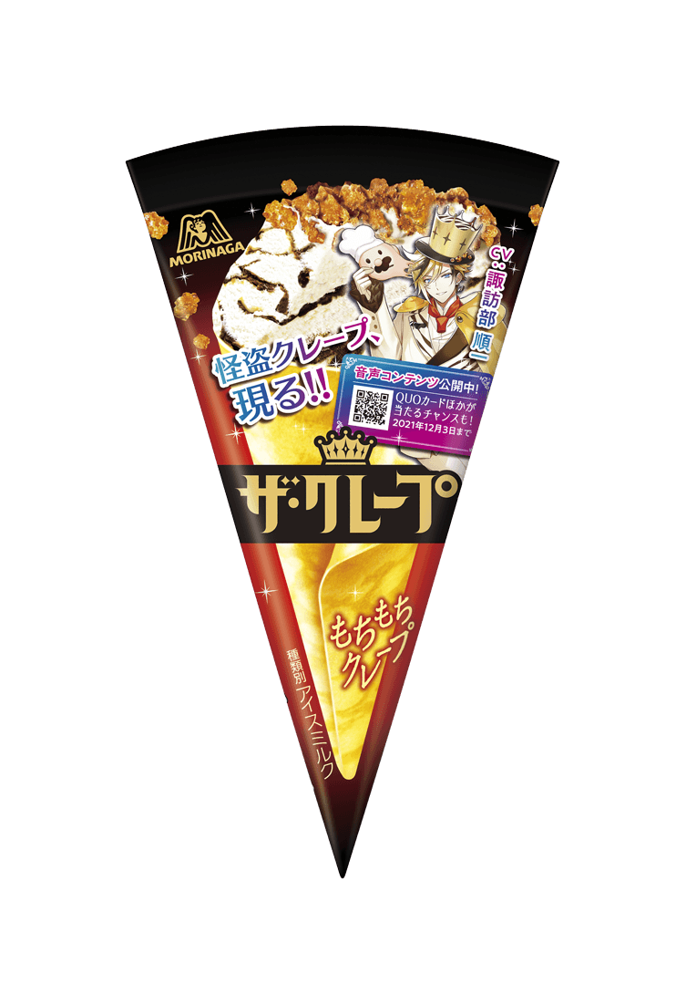 本ゲームの公開に伴い、“クレープおじさん”の仮面を外したイケメン姿の怪盗クレープが描かれた、「ザ・クレープ」の期間限定パッケージも登場。クレープ柄のマントやビスケットクランチがあしらわれた王冠など、「ザ・クレープ」をイメージしたキャラクターデザインにもご注目ください。