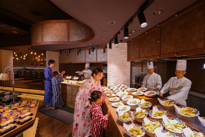 そのため、大江戸温泉物語グループのほぼすべてのホテル・宿にライブキッチンを設けています。目の前で調理、提供をするライブキッチンは見ているだけでわくわくし、また、出来たてを楽しめます。