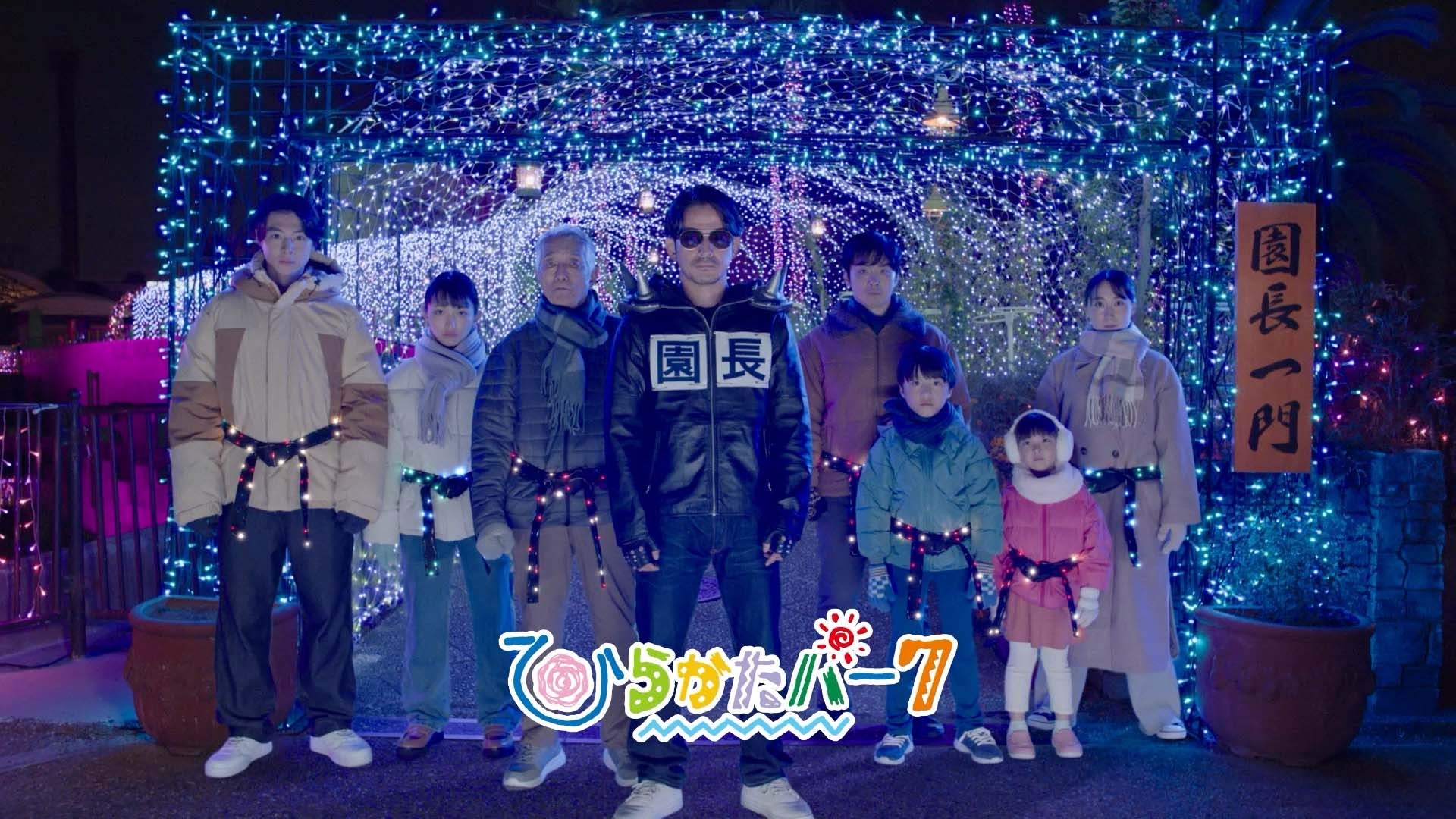 寒さ厳しき折、園長のもとへ集まりし来園者たち。年齢も性別もバラバラな彼らの目の前には光り輝くイルミネーションの門。人はこの門の前に立つと覚悟を決めなくてはならない。なぜならその門をくぐれば誰もが、ひらパーに古くから伝わるある一門に入門することになるからだ。その一門の名は「園長一門」。入門したら最後、否応なく園長流のイルミの奥深い世界にいざなわれ、当たり前のイルミの楽しみ方はもう遠い過去のものとなる。だがもはや一瞬の迷いも許されない。彼らは今、この門の中へと歩き出す・・・。これまでなら「わーイルミ、めっちゃキレイ!」「めちゃめちゃロマンチックやんけ!」だった。だが園長一門はそんな通り一遍の感想では済まされない。彼らの心には容赦なく園長の声がこだまするからだ。園長「ひらパーのイルミネーション最高やな!」「押忍!」入って数歩で、もう園長と互いに阿吽の呼吸が生まれている。「最低10回は来るよな!」「押忍!」数十メートルもなかったその道を歩き終えるまでには、園長の教えの数々を喜んで叩き込まれる。イルミを見に来ただけなのに・・・。ひらパーに着いたときは、ただの来園者だった。なのに今では有段者、「心・技・体」と書いて「イ・ル・ミ」と読んでしまうほど骨の髄まで園長一門の門下生、いや、「門下星」だ。おめでとう、誰一人欠けることなく、ここまで来れた。寿ぐ気持ちを抑え、威厳を崩すまいと、きっと前を見つめる園長。イルミの道を歩き終え、明るい光を放つ門の前にずらりと並ぶ園長一門。と、園長のうしろで何やらカラフルにチカチカしている。チカチカ点滅しているのは、門下星たちの帯。まさか「アリガトウ」のサイン・・・。いや、たんにイルミがきれいで浮かれているのだ。園長に見えてないし、チカチカさせて大丈夫、そんな気の緩み。だが園長の目は誤魔化せない。不動心に水を差す気配を背中で察知して「やめっ!」園長の号令が寒空に響く。と、帯のチカチカがぴたっと止んだ。あまりの勢いにぴたっと自主的に消える帯の電球たち…。電球だけピンポイントで、びびらせられるんかい!