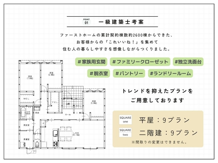 カーボンニュートラルに貢献する「ZEH」を標準仕様とし、ファーストホームの累計契約棟数約2,600棟の家づくりの中から、好評だったお客様の声を集めて住む人の暮らしやすさを第一に考え、一級建築士監修のもと開発しました。建築坪数に応じて「SQUARE one(平屋)」・「SQUARE two(二階建)」を各9プラン用意しています。