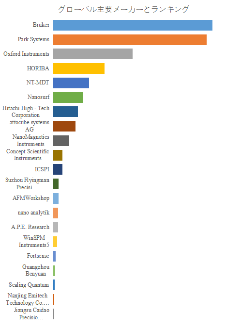 LP Informationのトップ企業研究センターによると、原子間力顕微鏡 (AFM)の世界的な主要製造業者には、Bruker、Park Systems、Oxford Instruments、HORIBA、NT-MDT、Nanosurf、attocube systems AG、Hitachi High - Tech Corporation、NanoMagnetics Instruments、Concept Scientific Instrumentsなどが含まれている。2024年、世界のトップ10企業は売上の観点から約77.0%の市場シェアを持っていた。