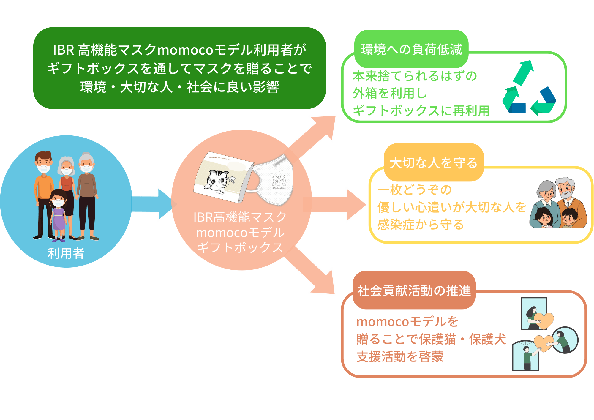 今回、パッケージをリニューアルした「IBR高機能マスクmomocoモデル」は、本来捨てられるはずだった外箱がギフトボックスにアップサイクルされるため、ゴミの削減と同時に環境への負担低減となります。また、身近な人に一枚どうぞのやさしい心遣いが自然と生まれ、大切な人を高機能マスクで感染症から守り、保護猫・保護犬支援活動の啓蒙にもつながります。
