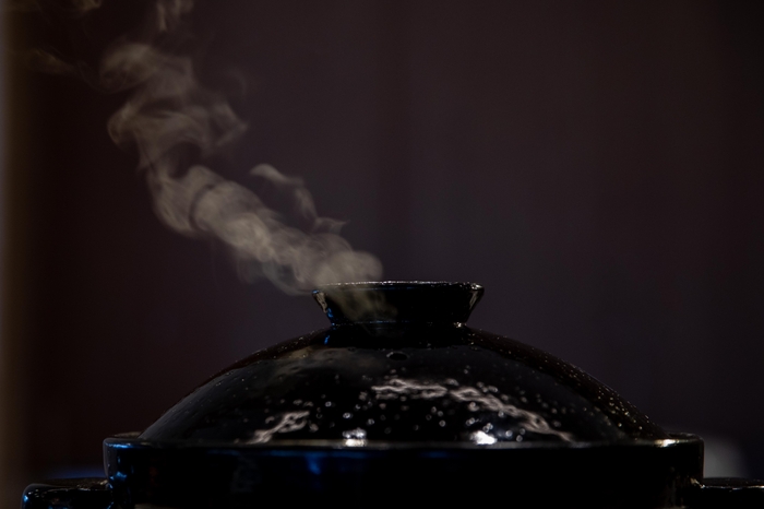 ◆コースのお食事では、仙台味噌焼きおにぎりを炭火の網の上に置いて、大葉に少し焦げ目がついたら、お好みで仙台牛しぐれ煮とわさびを添え、お出汁をかけてお召し上がりください