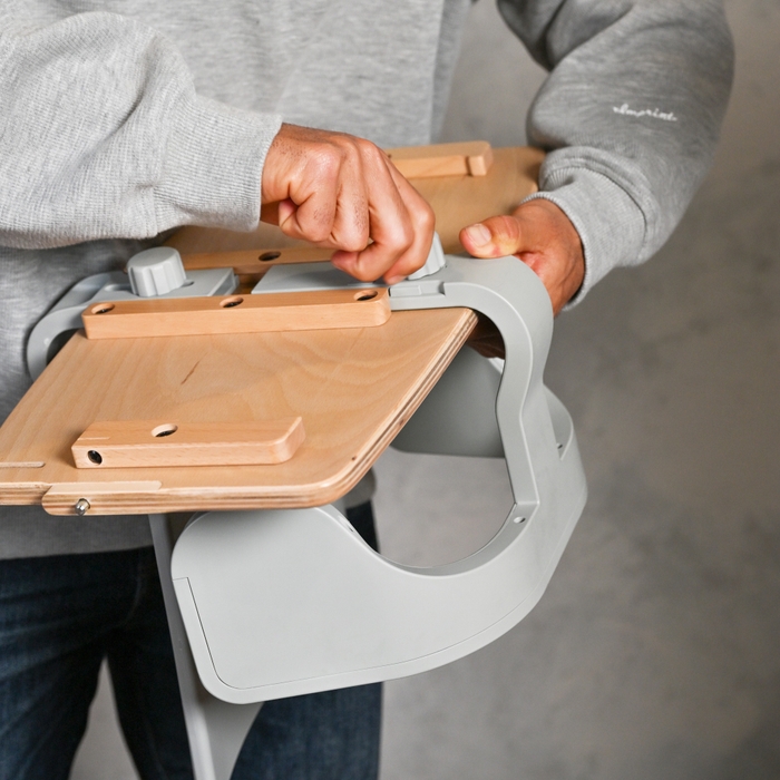座面・フットレストの取り付け・高さ調節は、板のレバーを握りながら溝に差し込むだけ。