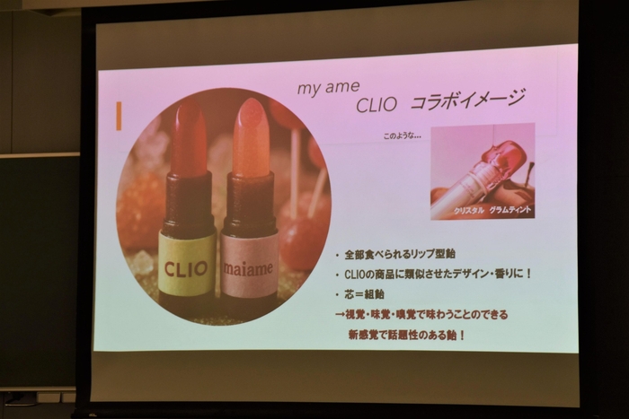 講演後には学生たちが考えたコラボ商品企画の提案を聞き、中村氏が講評しました。チョコレートのパイ菓子の中にクランキーチョコ商品を組み合わせる提案では「自分にはない発想。百貨店などの高級路線で販売するのもいいかもしれない」や、化粧品ブランドの人気リップを全て飴で商品化する案には「菓子というより、コスメのプロモーションのように行うのも面白いのではないか」など、学生たちのアイデアにマーケティングの視点からアドバイスを行っていました。