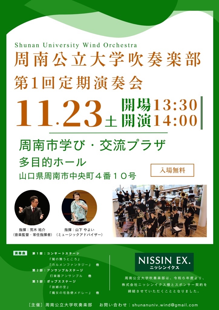 周南公立大学吹奏楽部が令和6年11月23日(土・祝)、周南市学び・交流プラザで、第1回定期演奏会を開催します。