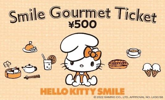 大人チケットをご購入いただいたお客様 1 名様に 1 枚ずつ、「HELLO KITTY SMILE」内の4つの飲食店で 利用いただける 500 円割引チケット『SMILE グルメチケット』をプレゼント