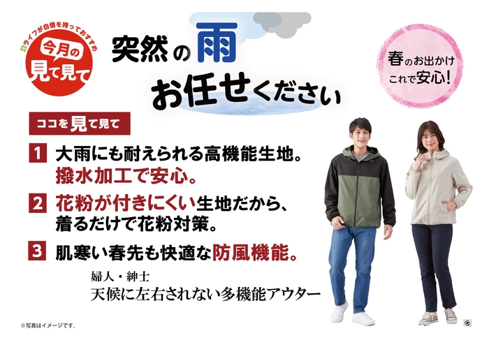 “おいしい” “ワクワク” “ハッピー” をお届けするライフコーポレーションは、「天候に左右されない多機能アウター」を、3月1日に近畿圏店舗で新発売いたしました。