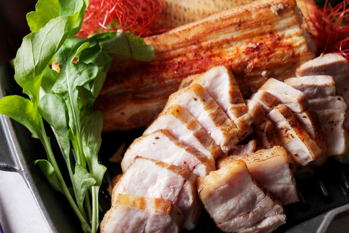 白トリュフ風味のマッシュポテト/金時芋のロースト/豚粗挽き肉のポルペッティ ローズマリーの香り(イタリア)/パリパリチキン ハニーマスタードソース(韓国/ランチのみ)/厚切り豚バラ肉とルッコラのサムギョプサル(イタリア×韓国/ディナーのみ)/豚肩ロースのポルケッタ ハーブ風味(イタリア/ランチのみ)/アンガス牛のポルケッタ サルサ・ヴェルデ(イタリア/ディナーのみ)