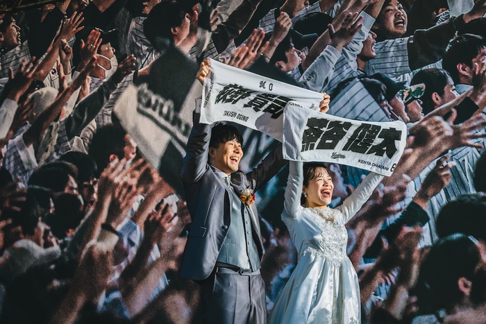 熱気と興奮を表したくてまずはポージング指導から。新郎新婦さまも「めっちゃいい」と大喜び。ナイターに合わせたストロボ使いもこだわり。「おふたりの素敵な思い出を残したい」一心で撮った一枚で受賞、最高です。