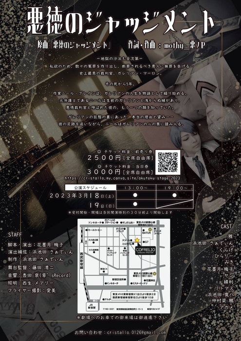 社会人演劇ユニットcristalloはボーカロイド楽曲を元にした舞台「悪徳のジャッジメント」を2023年3月18日(土)、3月19日(日)コフレリオ新宿シアター(東京都新宿区)にて上演します。