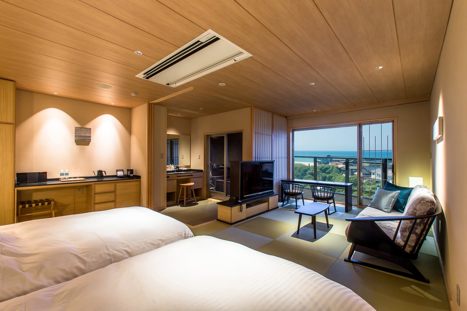 窓一面に広がる青い海、夕刻には茜色へと移りゆく景色、夕日カウンターやソファー、シモンズ製ダブルベッドが2台、24時間ご利用いただける専用の温泉展望風呂など、妊婦さんもゆったりとお寛ぎいただけます。