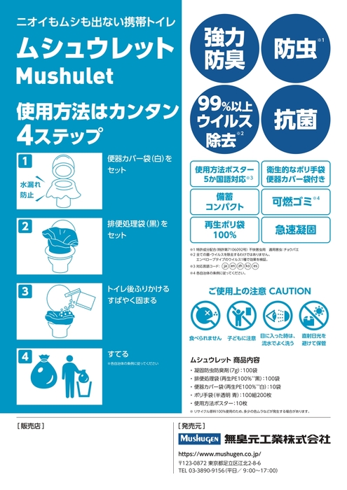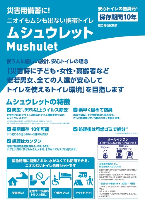 ニオイもムシも出ない災害時用携帯トイレ「ムシュウレット(Mushulet)」 1万個