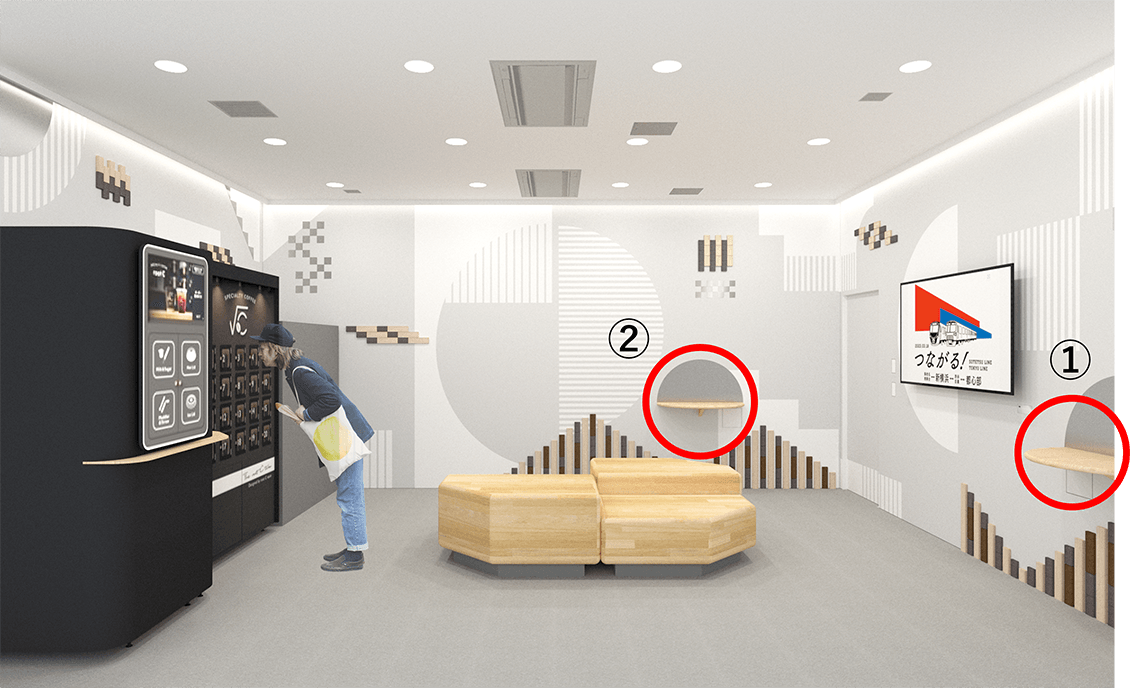 相鉄・東急新横浜線「新横浜」駅の待合室「Shin-Yoko Gateway Spot」内のカウンター(赤丸(1)、(2))となります。カウンター上の表示マークの上にスマートフォンやイヤホンといったIoTデバイス(Qi対応)を置くだけでワイヤレス充電が可能です。また、当社ではワイヤレス給電プラットフォーム・POWER SPOT(R)に対応するIoTデバイスを開発しており、住まいやオフィス、駅や商業施設などあらゆる場所を通じて、「いつでも、どこでも、ケーブルレスで電源にアクセスできるストレスフリーな新たなライフスタイル」の提供を目指して事業を展開して参ります。