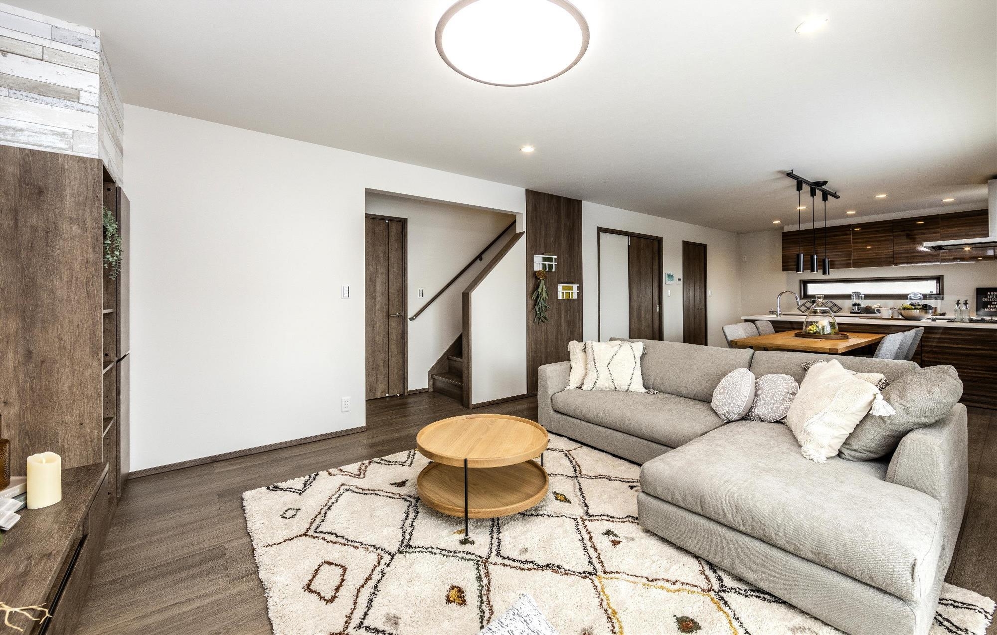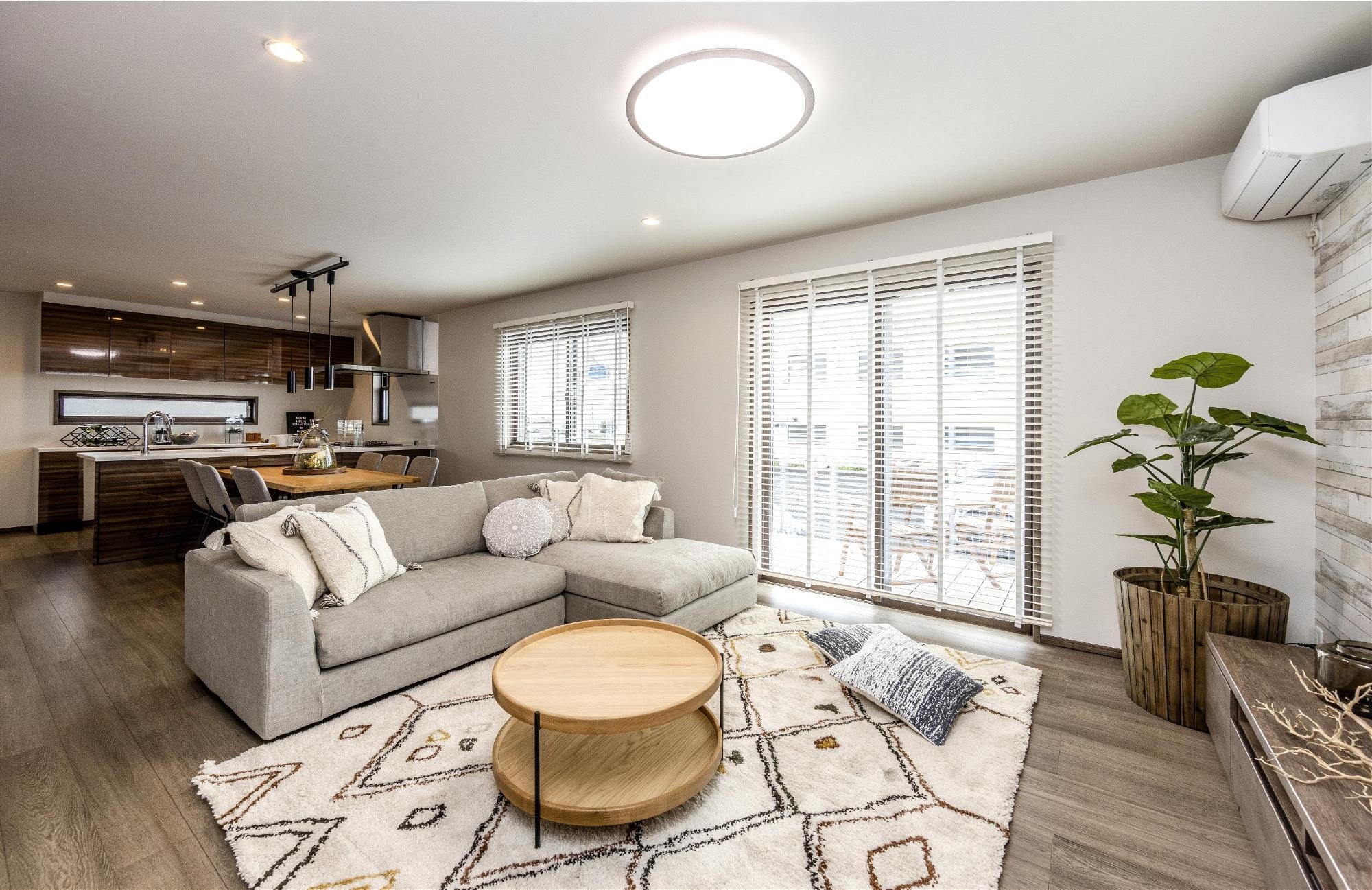 コミュニケーションを大切にしたLDKは、家族みんながゆったりくつろげる約20.5帖の広さを確保。開放感のあるオープンキッチンは、家族全員で食事の準備や後片付けがしやすくなります。また、リビングとつながるウッドデッキは、オープンエアの心地よいくつろぎを演出します。