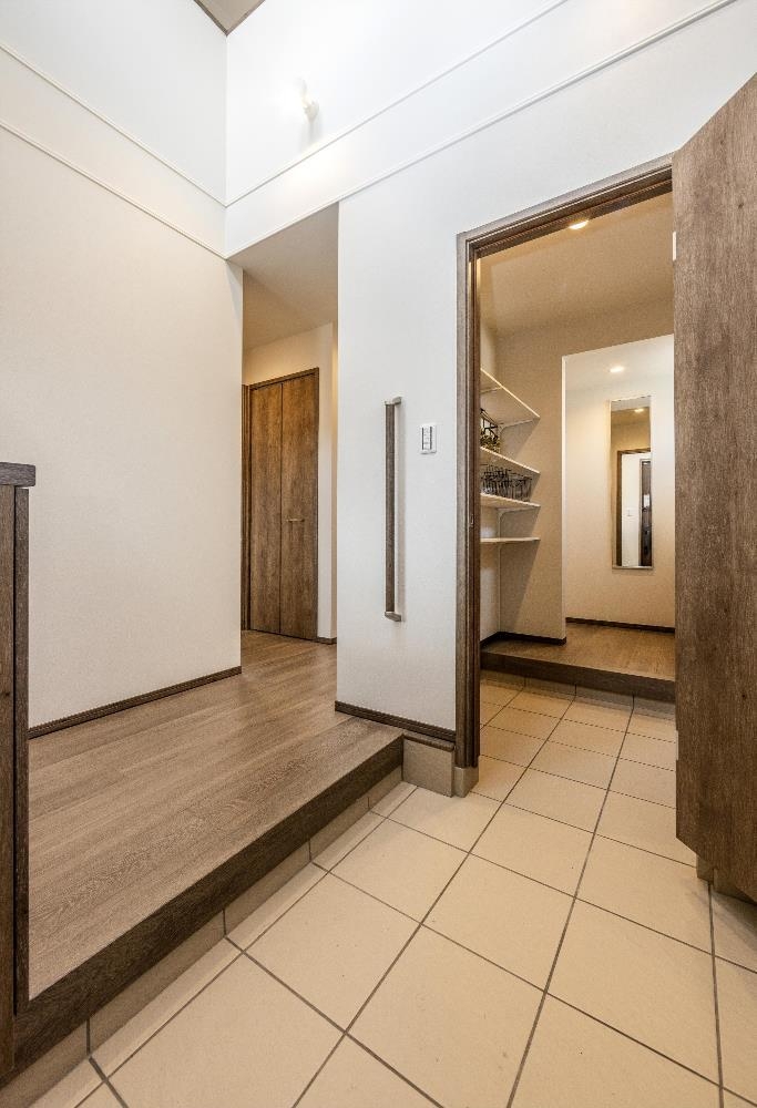 吹抜けのある玄関は、シューズクローゼットを経由してホールにつながる家族用の動線を確保。
