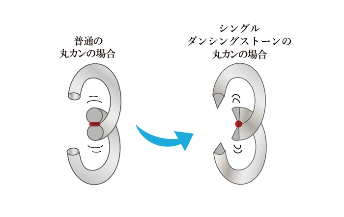 この内側に作られたエッジが、丸カン同士の摩擦抵抗減らし、不安定な状態を生み出します。