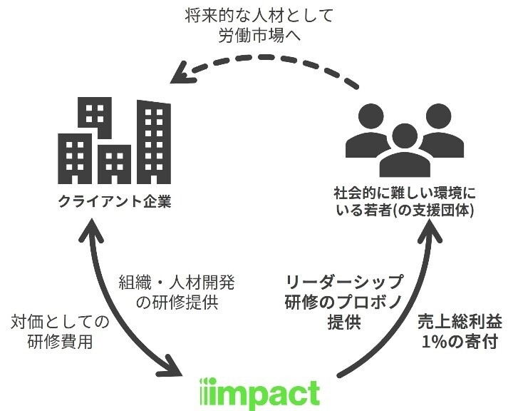企業のリーダーシップ開発投資を、寄付とプロボノ(研修の無償提供)という形で未来の若者に対して還流させていく。これがリーダーシップ・エコシステム(R)です。過去参加した学生へのインタビューはこちらから。( https://www.impactinternational.com/jp/action-sdgs/leadership-eco-system )