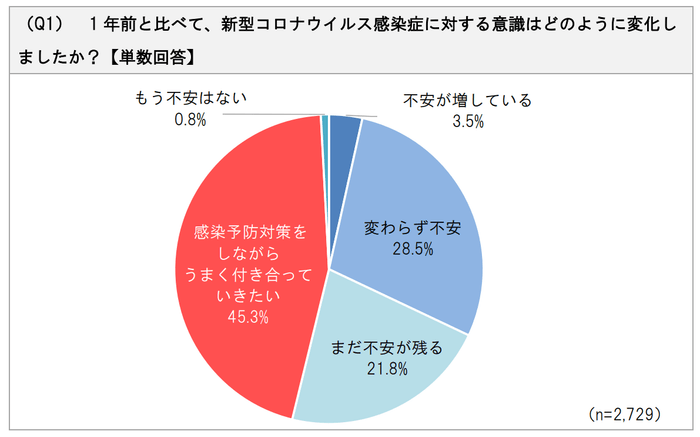 新型コロナウイルス感染症に対する1年前との意識の変化を聞いたところ、「感染予防対策をしながらうまく付き合っていきたい」と回答した方が45.3%で最多となりました。