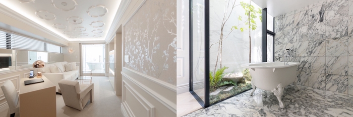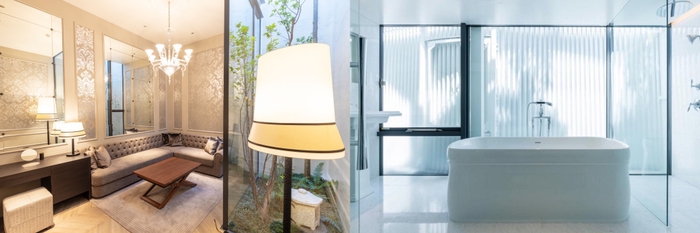 日本の繊細な季節のうつろいを表現した二十四節気から選んだカラーと、Cassina ixc.のインテリアデザインによる個性的な客室。3分の1がバスルームとなっており、大理石の浴室と猫足のバスタブ、バカラのシャンデリア、イタリアのモザイクタイルなど、お部屋ごとに素材とアイテムを変えて、コンパクトながらも贅沢で特別な空間を提供しております。