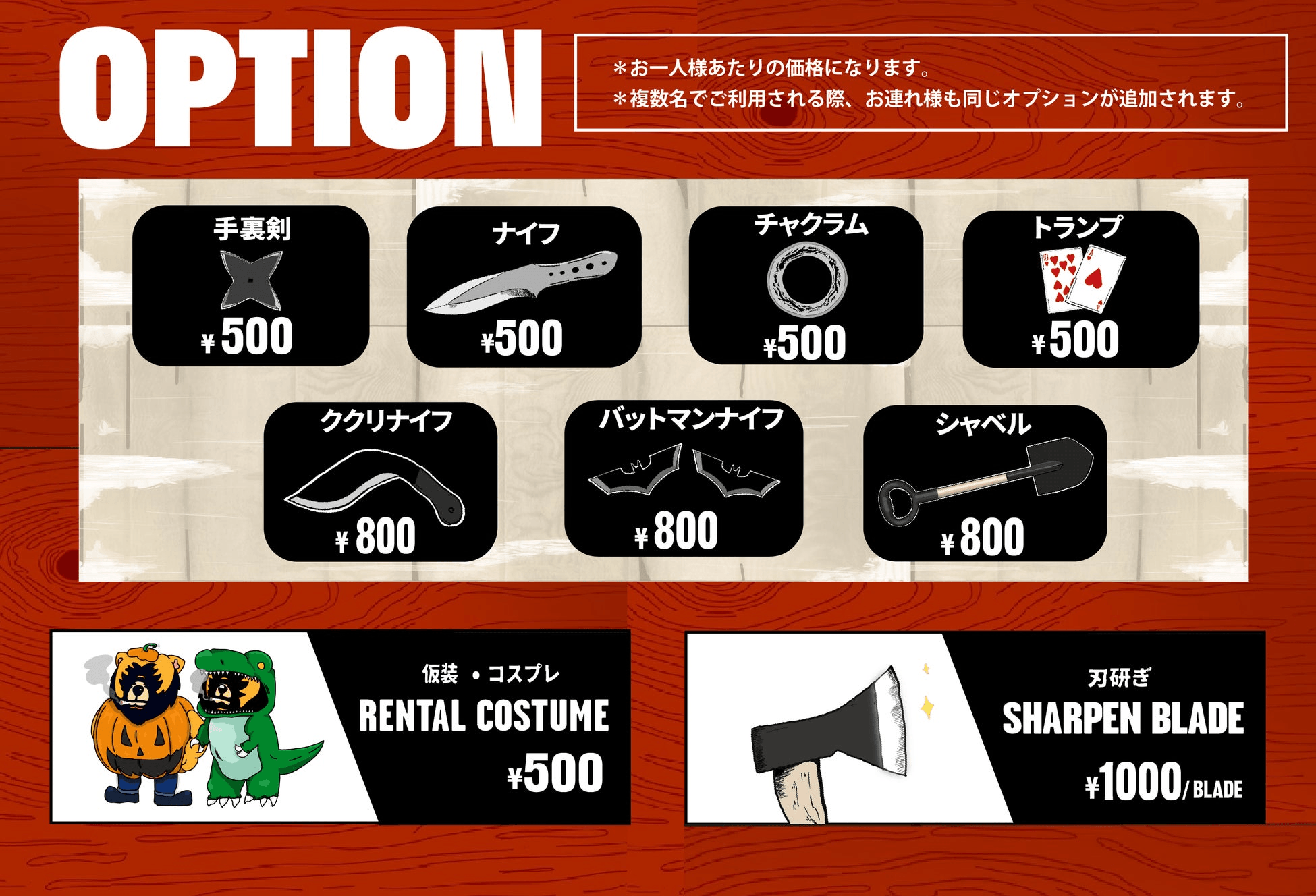 斧投げ "AXE THROWING" のオプションになり、1人800円を支払うことで利用することができます。