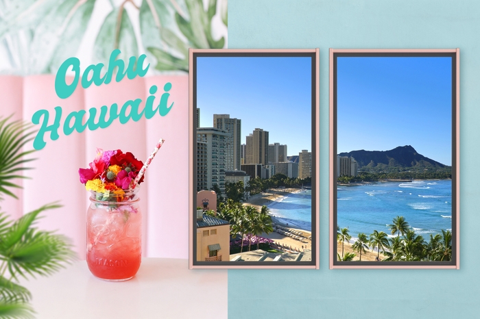 今回リリースするハワイ・オアフ島の風景は、「ハワイらしい風景が見たい」というユーザーリクエストに応え、ハワイ・オアフ島で最も有名なランドマークの一つ、ダイヤモンドヘッド州立記念碑、真っ白な砂浜のワイキキ・ビーチの両方が眺められる贅沢なオーシャンビューです。まるで、リゾートホテルのクラブフロアから、一日中オアフ島の美しい眺めを満喫しているかのような、優雅な気分をご自宅のお部屋で体験することができます。