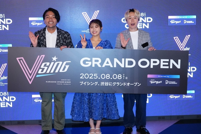カラオケBanBanを中心に全国398店舗を運営する株式会社シン・コーポレーション(本社:東京都港区、代表取締役社長:川口 範)は、2025年8月6日(水)、渋谷センター街にて新感覚カラオケステージ&バー「VSING」の発表会を開催いたしました。ゲストには、お笑いコンビ「見取り図」(盛山晋太郎さん・リリーさん)とタレントの渋谷凪咲さんを迎え、実際にステージでの歌唱と応援体験を披露いただきました。