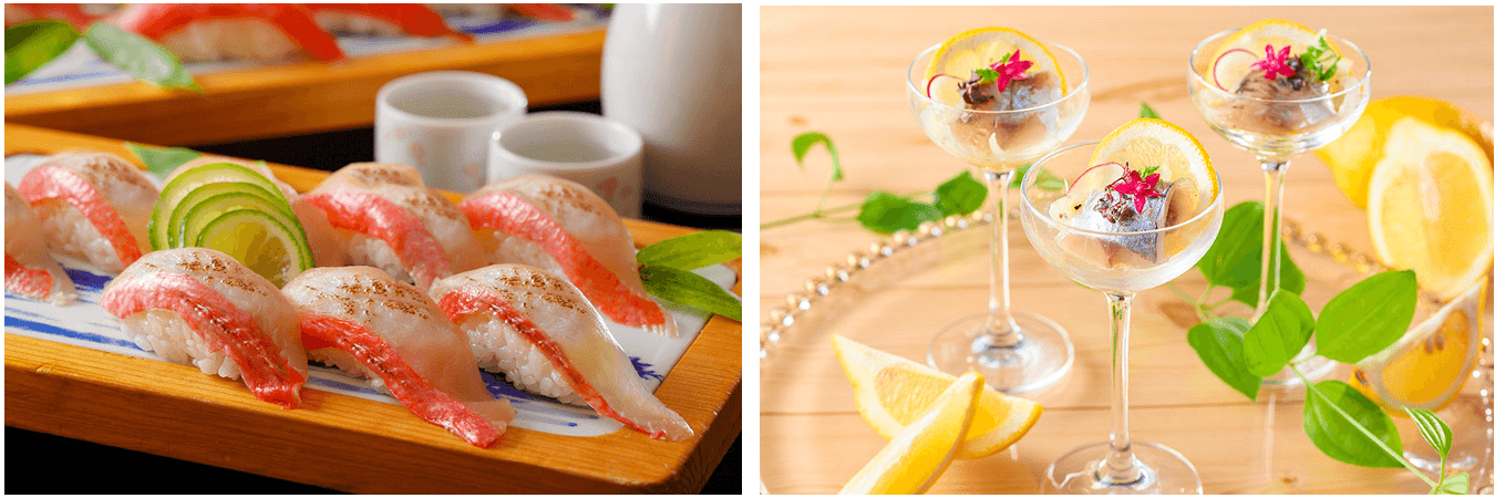 左:金目鯛の炙り寿司もご用意。炙ることでとろける脂が旨味を増し、生のお造りとはまた異なる美味しさを堪能いただけます。