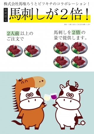 キャンペーン名:馬刺しが2倍キャンペーン 開催期間:2020年6月15日(月)~6月末 開催店舗:ビーフキッチンスタンド8店舗(アパホテル秋葉原店、西新宿店、歌舞伎町店、新橋店、新杉田店、野毛店、蒲田店、立川北口店) 内容:馬刺しを2人前以上のご注文で、2倍の量で提供します。 ※お一人様1品以上ご注文をお願いします。お通し・チャージ料などはございません。
