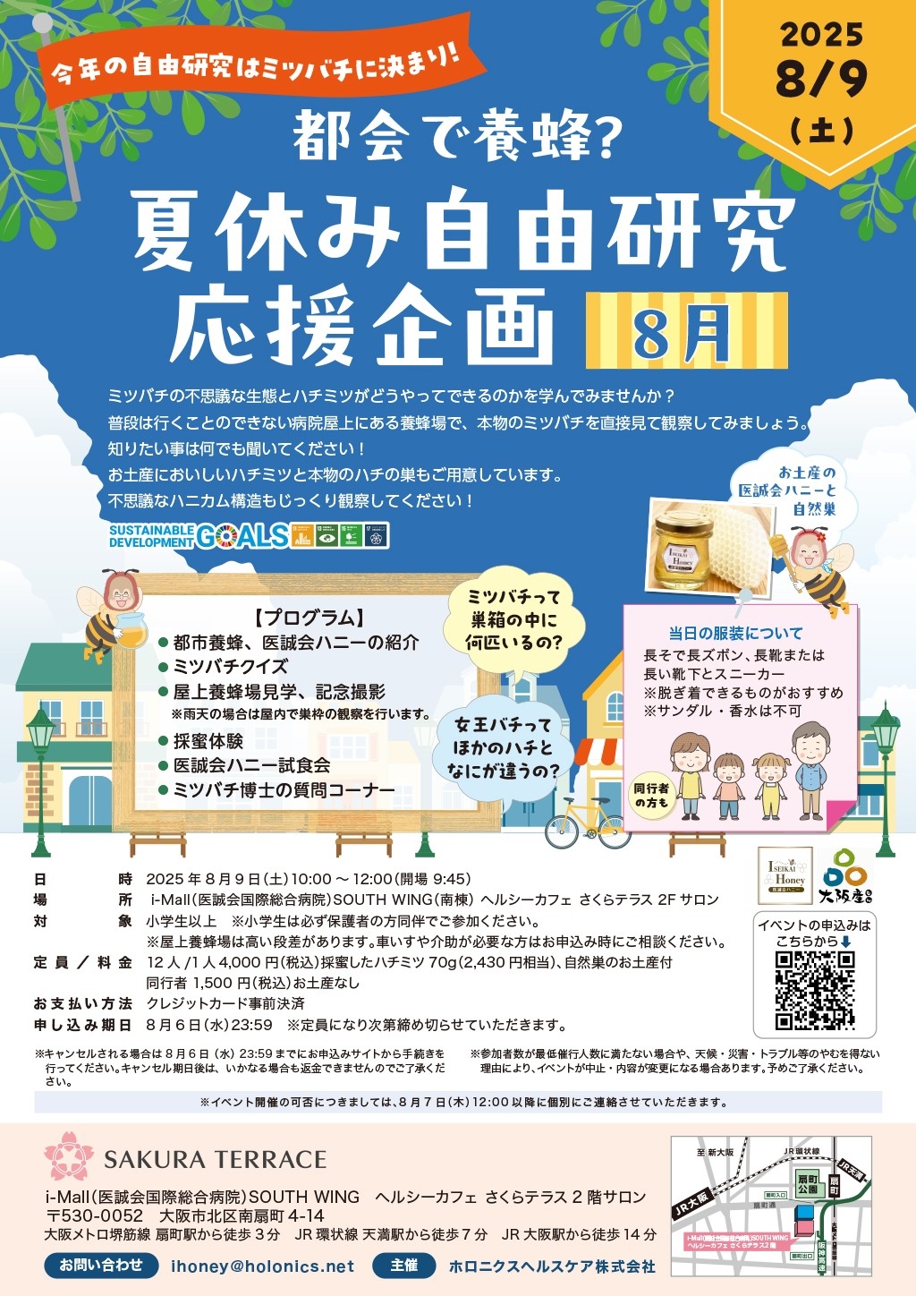 医療法人医誠会(本社:大阪府大阪市、代表者:谷幸治)が運営する医誠会国際総合病院併設のヘルシーカフェさくらテラスは、2025年8月9日(土)に夏休み自由研究応援企画「都会で養蜂?夏休み自由研究応援企画 8月」を開催します。