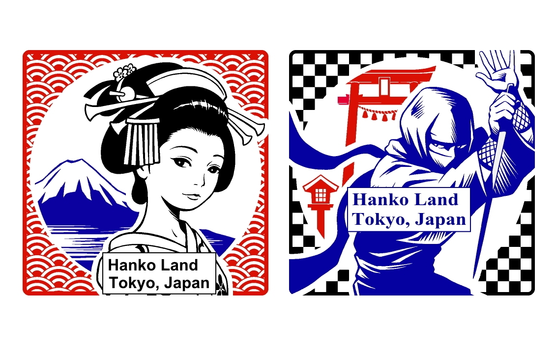 日本の伝統芸術である木版画の「色を重ねてひとつの絵を完成させる」手法を簡略化させたこの3色スタンプセットは、忍者・サムライ・着物女性など日本的な人物をデザインした10パターン。さらにスタンプの一部に店名を入れることで、外国人観光客にとってとても印象深い記念スタンプになります。