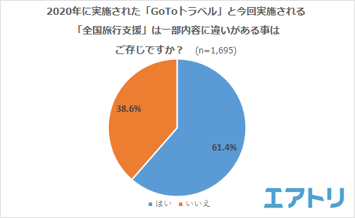 「はい」と回答した人は61.4%、「いいえ」と回答した人は38.6%となりました。前回実施されたGoToトラベルと今回の全国旅行支援では、適応される割引金額や条件が一部変更になりましたが、「支援内容がわかりにくい」と言う声が多く届きました。