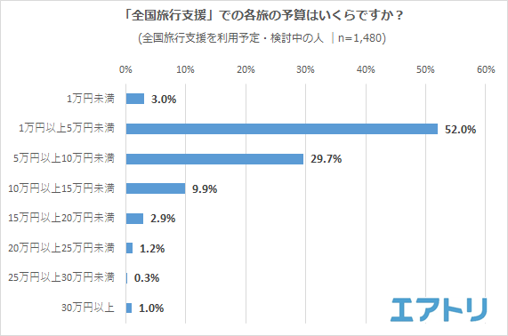 最も多かったのは「1万円以上~5万円未満(52.0%)」が過半数を超え、全国旅行支援の割引が適応されれば大幅に予算をおさえられるため期待の大きさがわかります。2番は「5万円以上~10万円未満(29.7%)」、3番目は「10万円以上~15万円未満(9.9%)」となりました。また「10万円以上~の予算」の人を合わせると15.3%もいることから、割引が適応されることにより普段ではなかなか利用が難しいハイクラス旅を期待する人も少なからずいることがわかります。