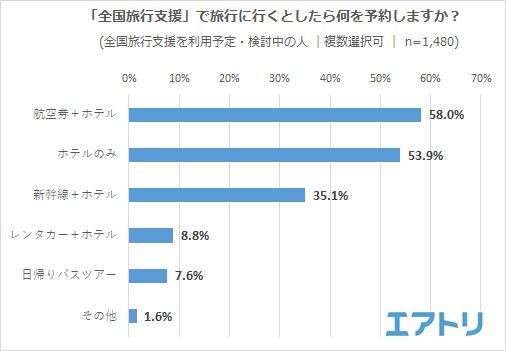 旅行手段としては最多が「航空券+ホテル」が58.0%、次いで「ホテルのみ」が53.9%、「新幹線+ホテル」が35.1%となりました。