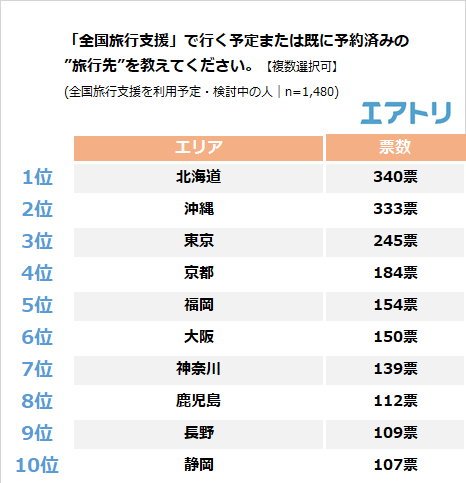 全国旅行支援で行く予定の旅先は、1位が「北海道(340票)」、2位は「沖縄(333票)」、3位は「東京(245票)」の順となりました。