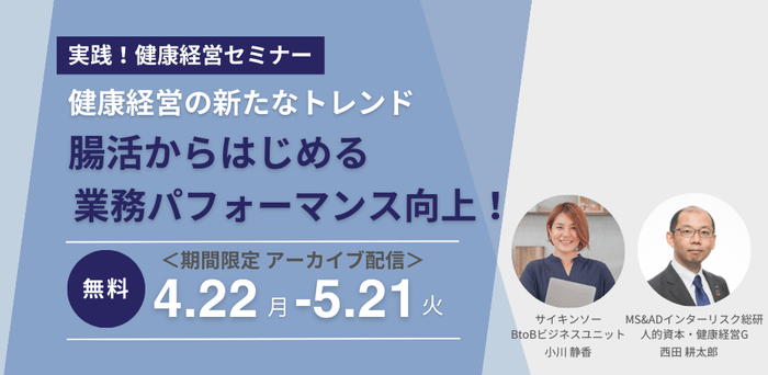 MS&ADインシュアランス グループのMS&ADインターリスク総研株式会社(代表取締役社長:一本木 真史)は、2024年3月26日に開催した「<実践!健康経営セミナー>健康経営の新たなトレンド 腸活からはじめる業務パフォーマンス向上!」のセミナー内容について、2024年4月22日から5月21日までの期間限定でアーカイブ配信を行います。本セミナーでは、メディアなどでも注目の「腸活」の効果や健康経営での活用事例および業務パフォーマンス向上につながるコンディション調整の視点について解説しています。