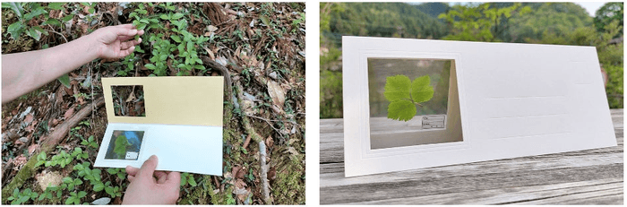 ② 散策路で見つけた自然のかけらをカードに閉じ込め、採取地や日付、その時の光景・気持ちなど、思い思いに書き添えれば、旅の標本カードの完成です。