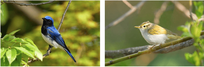 左:日本三鳴鳥の1つ、「オオルリ」。写真は光沢のある美しい青色の羽を持つオス。