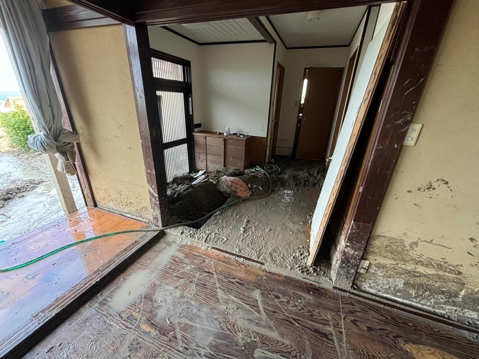 ボランティア協議会の学生たちの活動場所は「ワイプラザ」から車で約10分の所にある土石流被害を受けた住宅で、この家にいた主婦によると、大雨特別警報が出た際に2階に垂直避難しましたが、その直後に裏山が崩れ、1階は土砂に埋まりました。主婦は近所の住民が窓ガラスを割り、かろうじて自宅を抜け出すことができたそうです。