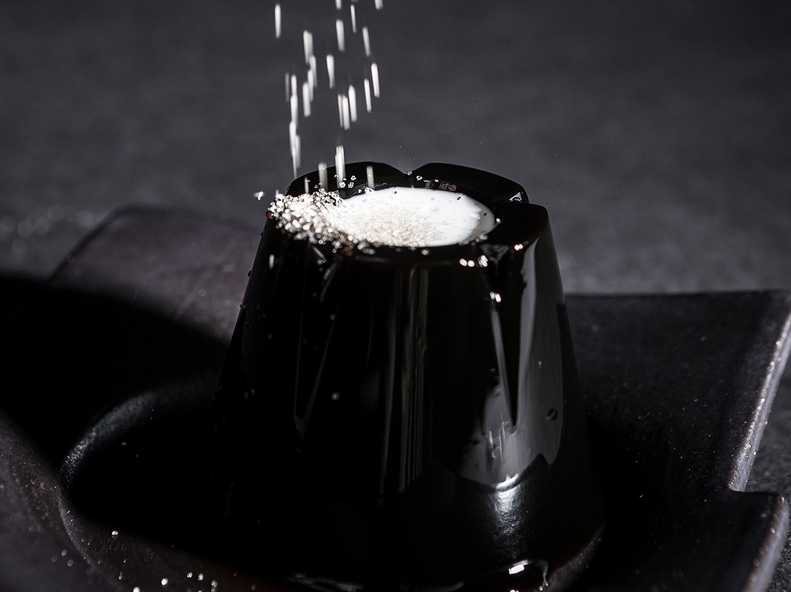 ゼリーをうつわに移してポーションミルクをかけると、キリマンジャロ山頂にある氷河があらわれます。また、ゼリーの上に付属のブラウンシュガーをかけると…まるで雪がふっているような様子に。涼しげな雪景色と、シュガーのシャリシャリとした食感をお楽しみいただけます。