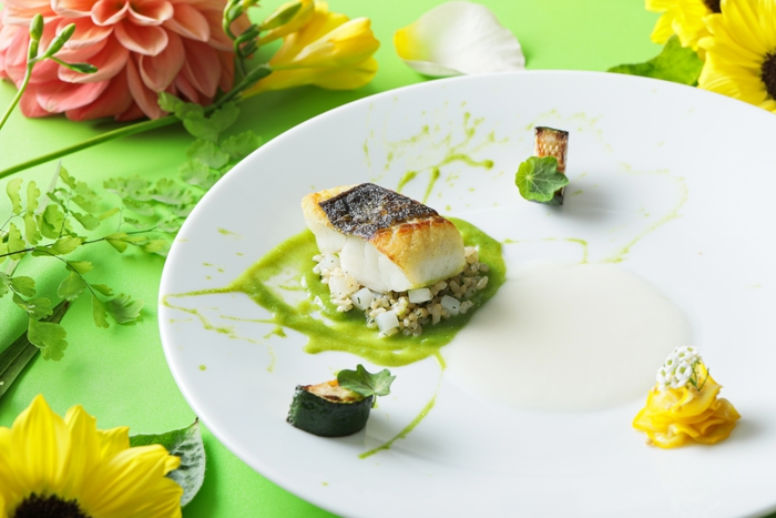 愛知県産スズキのポワレ アオリイカと玄米のピラフ ズッキーニのクーリと魚介のナージュ