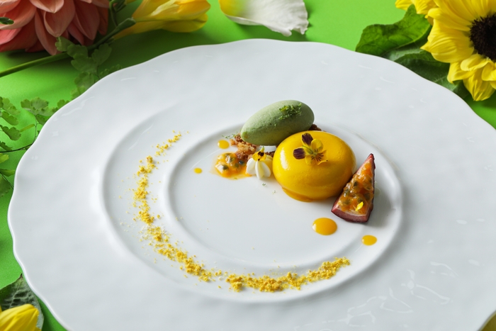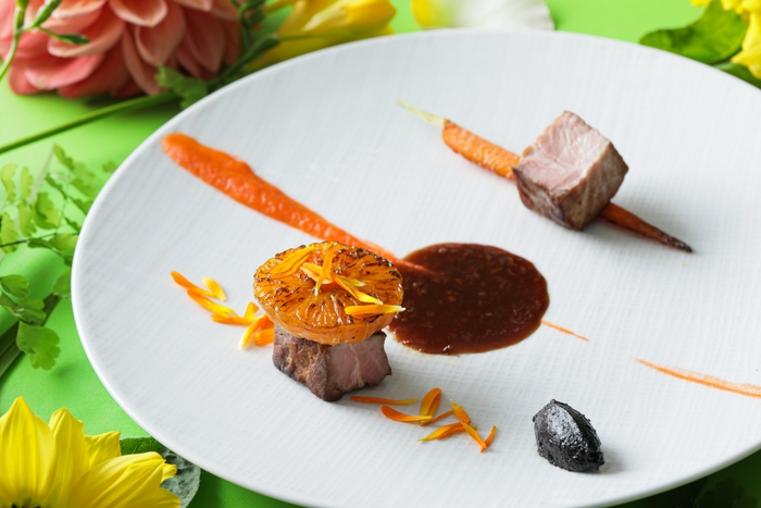 冷前菜は、旬の鹿児島県産カンパチとイエローパプリカを、レモングラス香るトマトジュレで味わうさっぱりとした一品に、温前菜にはオマール海老、熟したマンゴーの甘み、ココナッツミルクのアンサンブルが楽しめる一品をご用意。メインは、鹿児島県産黒豚を、香り高いオレンジリキュールでフランベしたフレッシュオレンジと共にご提供。“薩摩富士ふもとのひまわり畑”を表現したフルコースをご堪能いただけます。