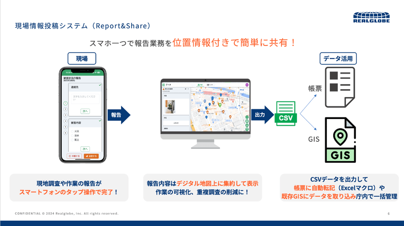 リアルグローブが提供する「REPORT&SHARE」は、スマートフォンから写真・位置情報付きの被災報告を地図上に集約し、行政職員や関係者間で情報を瞬時に共有することを可能にするシステムです。これにより、電話や無線に頼る従来の報告体制では難しかった、現場の「見える化」と判断の迅速化を支援します。