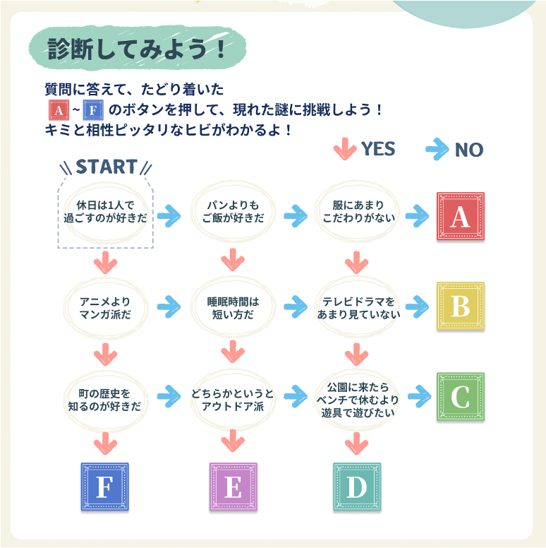 さらに、イベント特設サイトでは、簡単な質問に答えるだけで、“あなたにぴったりのヒビ”がわかる相性診断もご用意しています。診断結果からおすすめのエリアを選んでスタートするのも良し、家族や友人と「どこから回ろうか?」と相談するのも楽しみのひとつです。
