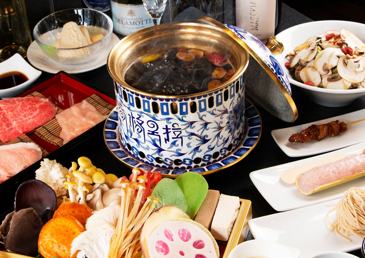 中国雲南省シャングリラ地域で取れる乾燥きのこ数十種類を、なつめやクコの実などと合わせて、じっくり煮込んだ、キノコ本来のうまみ深みが感じられる【無二のブラックスープ】を使用した一人一鍋スタイルのきのこしゃぶしゃぶ専門店。