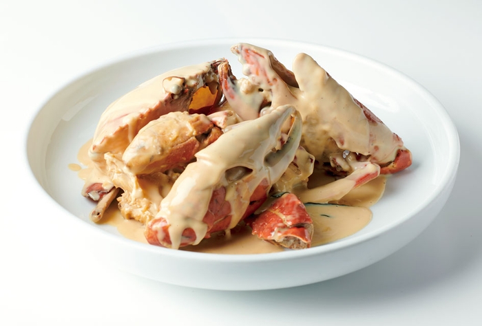 じっくり煮詰めたバターとクリームの濃厚なソースをマッドクラブと合わせました。カレーリーフでほんのり香りにアクセントをつけました。