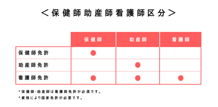 まず、法令の保健師助産師看護師法(昭和23年7月30日法律第203号)に定められた、それぞれの職に必要な免許を以下の表でまとめてみました。