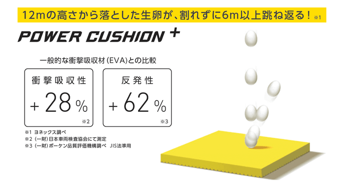 弊社独自の衝撃吸収性と反発性を併せ持つ衝撃吸収素材パワークッション。パワークッションに反発性の高い特殊樹脂を添加し、格子状に+型の溝を最適な間隔と深さで配置した新構造を採用した「パワークッション®プラス」は、従来の軽量性を保ちつつ、衝撃吸収性を28%※2、反発性を62%※3向上させ(一般的な衝撃吸収材[EVA]との比較)、12mの高さから落とした生卵が、割れずに6m以上跳ね返る新衝撃吸収反発素材です。